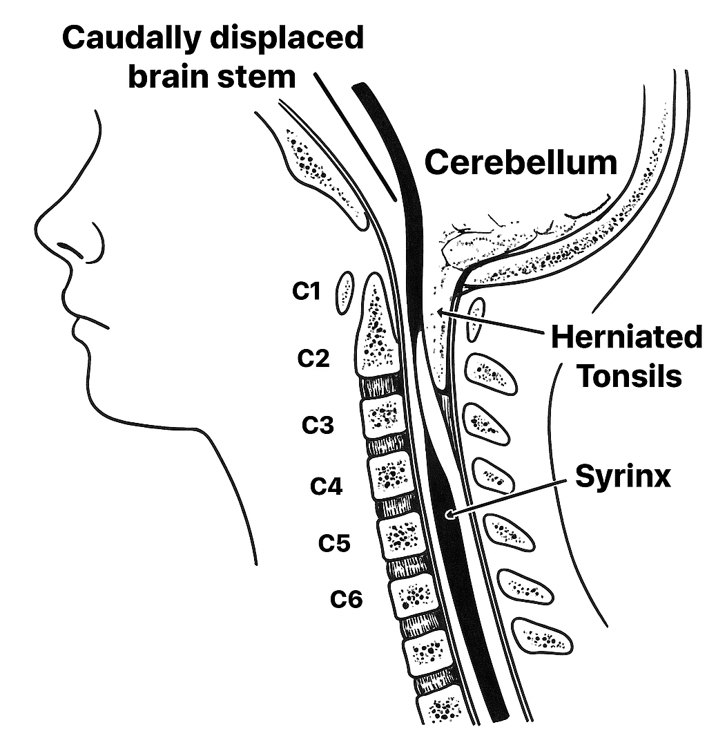 Door deze benige veranderingen is er niet meer genoeg plaats binnen de schedel voor enkele van de achterste/onderste hersendelen (kleine hersenen = cerebellum en tonsillen van de kleine hersenen). Door dit plaatsgebrek zoeken deze hersendelen een betere plaats en dat is dan bij de overgang tussen de schedel en de wervelkolom.